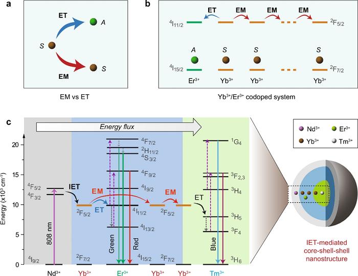 近日,华南理工大学发光材料与器件国家重点实验室周博教授团队提出了一种研究微观尺度能量迁移过程的新策略。通过构建界面能量传递IET(Interfacial Energy Transfer)调控的核壳纳米结构和能量输运过程设计,成功观测到敏化剂/激活剂共掺上转换体系的能量迁移特性,并通过定义特征参量(γEM)描述了能量迁移和能量传递的竞争。该模型以常规的NaYF4:Yb/Er作为研究对象,以NaYF4:Nd为吸收808 nm敏化光的壳层,通过设计NaYF4:Yb/Tm探测能量迁移。Tm3+的发光变化反映了NaYF4:Yb/Er中间层里Yb3+→Yb3+能量迁移和Yb3+→Er3+能量传递的竞争关系,并进一步采用蒙特卡洛模拟验证了实验结论。此外,该模型通过时域调控可进一步实现上转换光色调控。本研究促进了上转换动力学过程的深入理解,为操控纳米结构中的能量输运和调控发光颜色提供了新方法,在逻辑运算和信息安全等方面展示出应用潜力。