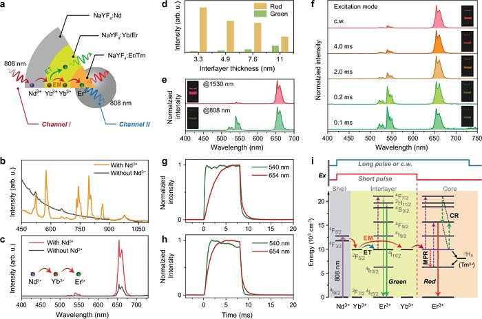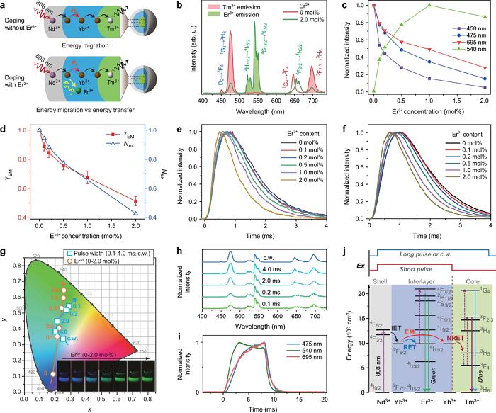 稀土上转换发光材料表现出优异的发光学性质,在诸多前沿领域表现出巨大的应用潜力。近期研究发现,能量迁移过程设计在上转换发光调控方面具有独特优势。然而,对于典型的敏化剂/激活剂共掺材料体系而言,能量迁移的发生及其与能量传递等其他过程的竞争关系尚未得到深入研究。而且能量迁移在时间尺度上会与其他过程同时发生,导致普通方法或材料设计难以将其区分并挑选出来。因此,如何获得能量迁移的规律以及实现对上转换发光颜色动力学调控是稀土发光领域的一项挑战性课题。