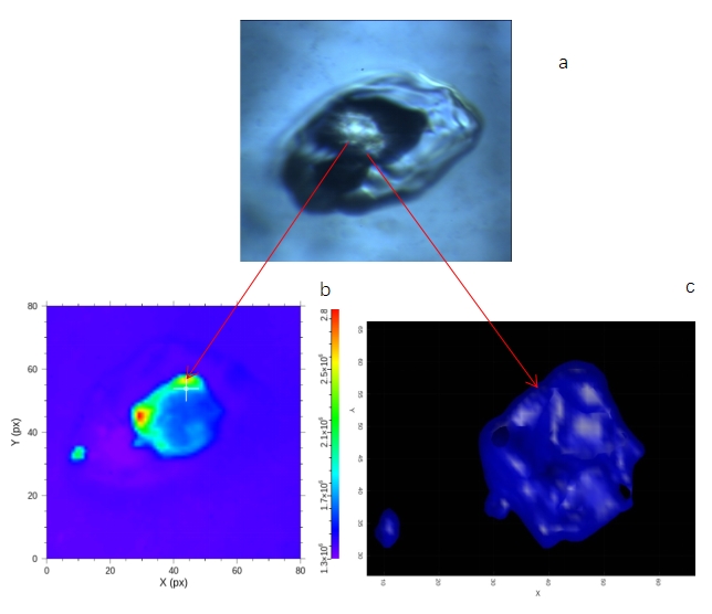 图2 包裹体的明场图像(a)、内部剖面图(b)和三维成像图(c)