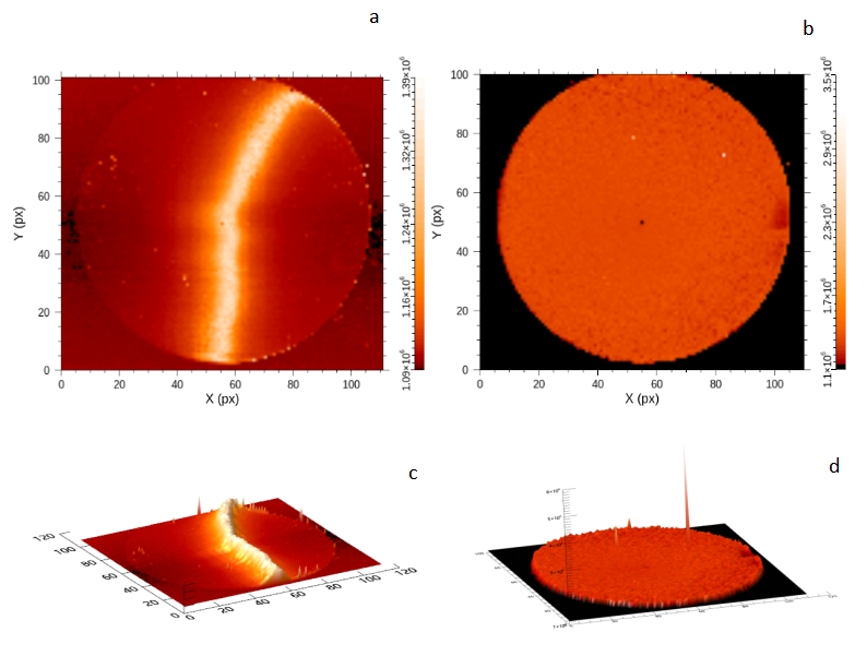 图 WSe晶圆样品,a(非自动聚焦)b(自动聚焦)的拉曼成像平面图;c(非自动聚焦)d(自动聚焦)的拉曼成像剖面图