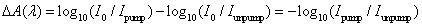 瞬态吸收测试的是材料被激发后吸收相对于稳态的瞬时变化。根据比尔-朗伯(Beer-Lambert)定律,一束光穿过均匀吸收介质会发生强度的衰减。以溶液样品为例,对于波长为λ的光,忽略散射作用,其透过样品的光强正比于光程L,液体样品的浓度c,以及其摩尔吸收系数e,其吸收度(Absorbance)表达为: (1)