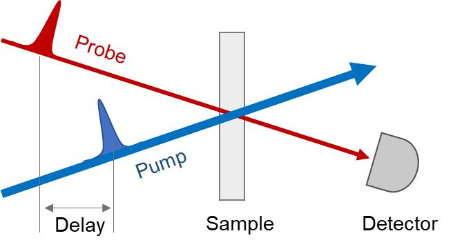 类似于大部分超快光谱技术,通常意义上的瞬态吸收是基于泵浦-探测(Pump-Probe)机制构建的技术,如图1所示。其中泵浦光为一束强脉冲激光,用于激发被测试材料;探测光为一束较弱的脉冲激光(通常功率密度小于泵浦光两个量级以上),用于探测材料被泵浦光瞬时激发之后的吸收度的变化。瞬态吸收光谱信号由有泵浦光与无泵浦光激发时探测光透过材料的吸收度相减获得,即: (2)