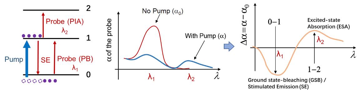 (3)受激辐射(SE):激发态的粒子处于非稳定状态,当处于激发态的粒子受到具有特定能量、偏振状态的光子作用后会回到基态,并同时发射一个具有相同能量的光子,即为受激辐射(也是激光发射的核心过程)。受激辐射产生的光会导致进入探测器的光强增加,出现一个负的ΔA信号。