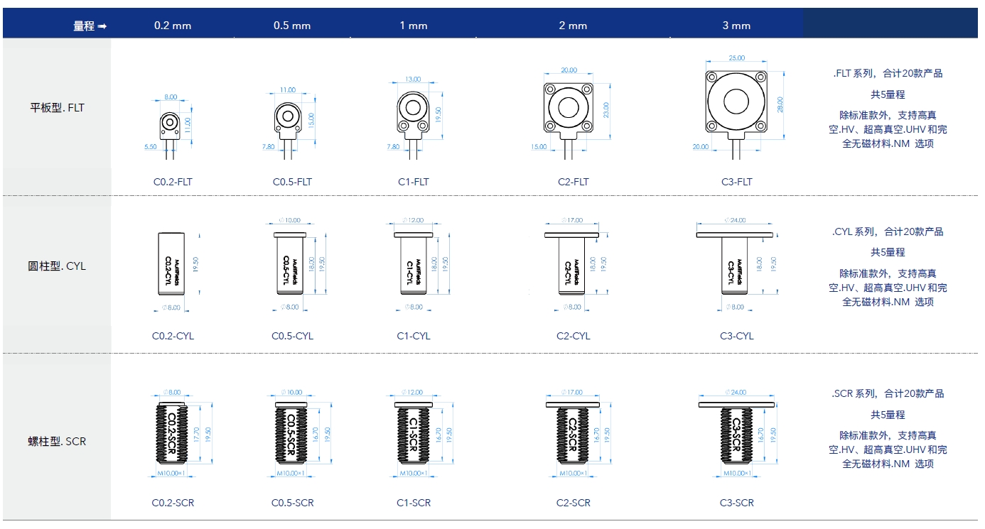 提供平板、圆柱和螺柱三种探头形式,量程覆盖范围 0.2 mm, 0.5 mm, 1mm, 2mm & 3mm,并提供高真空.HV, 超高真空.UHV 和完全无磁材料.NM 的多版本选择
